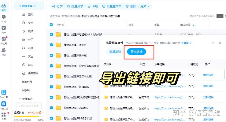 打开电脑端的百度网盘,多选资源,点批量分享,导出为表格,直接复制粘贴就行,每次可以100个,适用少量资源。